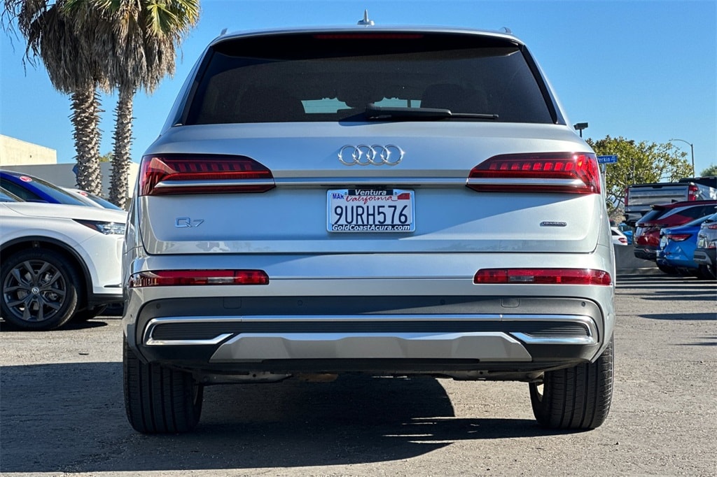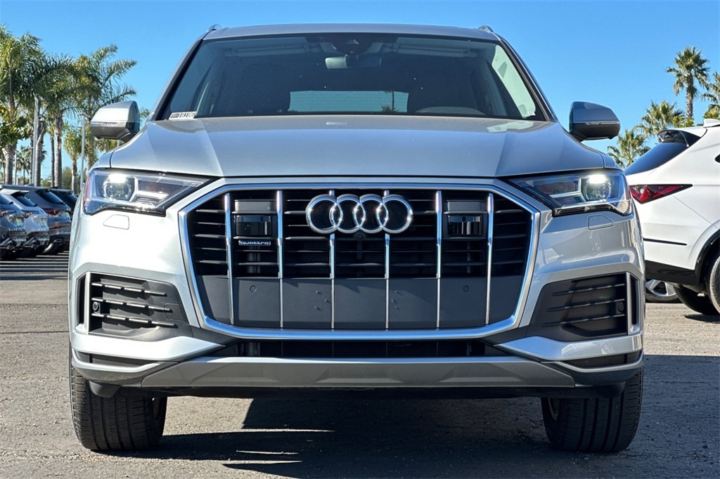 This 2023 Silver Audi Q7 45 Premium Plus AWD is well equipped and includes these features and benefits: 10 Speakers, 3.76 Axle Ratio, 3rd row seats: bench, 4-Wheel Disc Brakes, ABS brakes, Air Conditioning, Alloy wheels, AM/FM radio: SiriusXM w/ 360L, Auto High-beam Headlights, Auto-dimming door mirrors, Auto-dimming Rear-View mirror, Automatic temperature control, Brake assist, Bumpers: body-color, Compass, Delay-off headlights, Driver door bin, Driver vanity mirror, Dual front impact airbags, Dual front side impact airbags, Electronic Stability Control, Emergency communication system: Audi connect CARE, Exterior Parking Camera Rear, Four wheel independent suspension, Front anti-roll bar, Front Bucket Seats, Front Center Armrest, Front dual zone A/C, Front fog lights, Front reading lights, Fully automatic headlights, Garage door transmitter: HomeLink, Genuine wood door panel insert, Heated door mirrors, Heated Front Bucket Seats, Heated front seats, Illuminated entry, Leather Seating Surfaces, Leather Shift Knob, Leather steering wheel, Low tire pressure warning, Memory seat, Navigation system: Audi MMI Navigation plus with Touch Response, Occupant sensing airbag, Outside temperature display, Overhead airbag, Overhead console, Panic alarm, Passenger door bin, Passenger vanity mirror, Power door mirrors, Power driver seat, Power Liftgate, Power moonroof: Panoramic, Power passenger seat, Power steering, Power windows, Radio data system, Radio: Audi Sound System, Rain sensing wipers, Rear air conditioning, Rear anti-roll bar, Rear fog lights, Rear reading lights, Rear seat center armrest, Rear side impact airbag, Rear window defroster, Rear window wiper, Reclining 3rd row seat, Remote keyless entry, Roof rack: rails only, Security system, Speed control, Speed-sensing steering, Split folding rear seat, Spoiler, Steering wheel memory, Steering wheel mounted audio controls, Tachometer, Telescoping steering wheel, Tilt steering wheel, Traction control, Trip computer, Turn signal indicator mirrors, Variably intermittent wipers, and Wheels: 19" 5-Arm-Star Design.