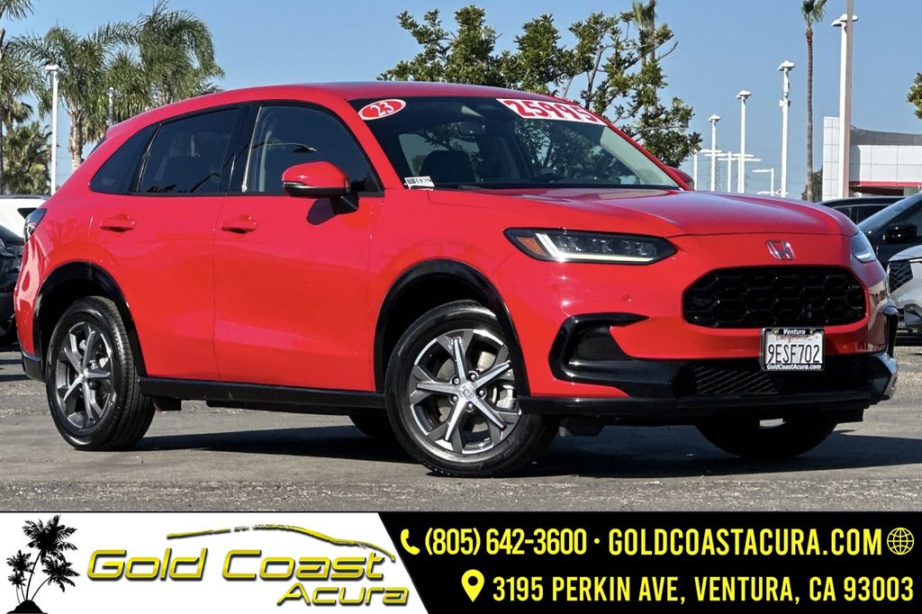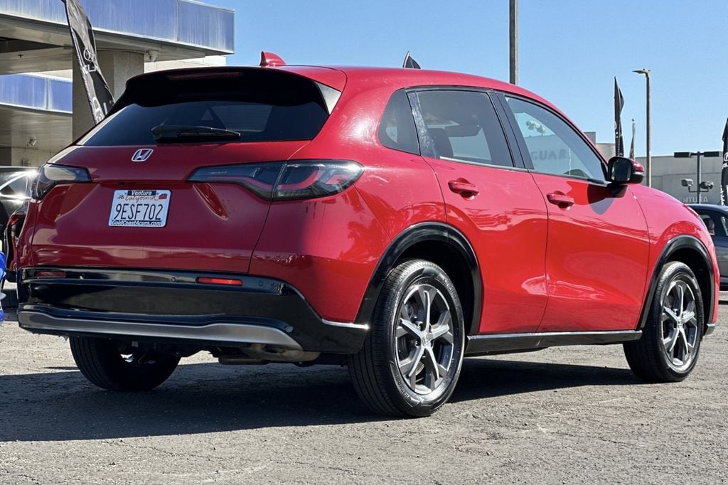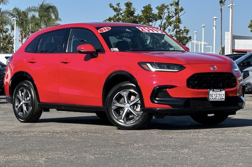 This 2023 Red Honda HR-V EX-L FWD is well equipped and includes these features and benefits: 17" Machine-Finished Alloy Wheels, 4-Wheel Disc Brakes, 5.436 Axle Ratio, 8 Speakers, ABS brakes, Adaptive Cruise Control: Adaptive Cruise Control (ACC) with Low-Speed Follow, Air Conditioning, Alloy wheels, AM/FM radio: SiriusXM, Apple CarPlay/Android Auto, Auto High-beam Headlights, Auto-dimming Rear-View mirror, Automatic temperature control, Blind Spot Information (BSI) System warning, Brake assist, Bumpers: body-color, Compass, Delay-off headlights, Driver door bin, Driver vanity mirror, Dual front impact airbags, Dual front side impact airbags, Electronic Stability Control, Emergency communication system: HondaLink, Exterior Parking Camera Rear, Four wheel independent suspension, Front anti-roll bar, Front Bucket Seats, Front Center Armrest, Front dual zone A/C, Front reading lights, Fully automatic headlights, Heated door mirrors, Heated Front Bucket Seats, Heated front seats, Illuminated entry, Knee airbag, Leather Shift Knob, Leather-Trimmed Seats, Low tire pressure warning, Occupant sensing airbag, Outside temperature display, Overhead airbag, Panic alarm, Passenger door bin, Passenger vanity mirror, Power door mirrors, Power driver seat, Power moonroof, Power steering, Power windows, Radio data system, Radio: 180-Watt Audio System w/8 Speakers, Rear anti-roll bar, Rear reading lights, Rear side impact airbag, Rear window defroster, Rear window wiper, Remote keyless entry, Security system, Speed control, Speed-sensing steering, Split folding rear seat, Spoiler, Steering wheel mounted audio controls, Tachometer, Telescoping steering wheel, Tilt steering wheel, Traction control, Trip computer, Turn signal indicator mirrors, and Variably intermittent wipers.