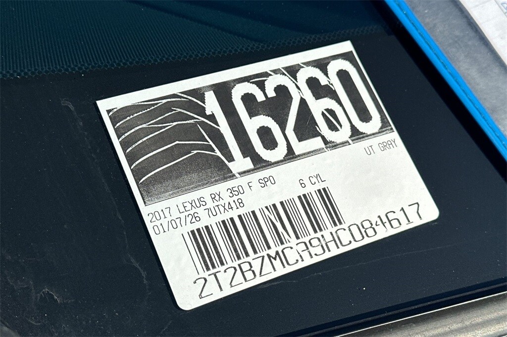 Recent Arrival! This 2017 Gray Lexus RX 350 F Sport AWD is well equipped and includes these features and benefits: AWD, Gray, 2.277 Axle Ratio, 4-Wheel Disc Brakes, 9 Speakers, ABS brakes, Adaptive suspension, Air Conditioning, Alloy wheels, Aluminum Roof Rails, AM/FM radio: SiriusXM, Anti-whiplash front head restraints, Auto High-beam Headlights, Auto tilt-away steering wheel, Auto-dimming door mirrors, Auto-dimming Rear-View mirror, Automatic temperature control, Backup Monitor, Bumpers: body-color, CD player, Compass, Delay-off headlights, Driver door bin, Driver vanity mirror, Dual front impact airbags, Dual front side impact airbags, Electronic Stability Control, Emergency communication system: Safety Connect, Exterior Parking Camera Rear, F Sport Heated Steering Wheel w/Paddle Shifters, F Sport Leather, F Sport Wheel Caps, Four wheel independent suspension, Front anti-roll bar, Front Bucket Seats, Front Center Armrest, Front dual zone A/C, Front fog lights, Front reading lights, Fully automatic headlights, Garage door transmitter: HomeLink, Heated & Ventilated Front Bucket Seats, Heated door mirrors, Heated front seats, Heated steering wheel, Illuminated Aluminum Door Trim, Illuminated entry, Knee airbag, Leather Shift Knob, Leather steering wheel, Low tire pressure warning, Memory seat, Occupant sensing airbag, Outside temperature display, Overhead airbag, Overhead console, Panic alarm, Passenger door bin, Passenger vanity mirror, Power door mirrors, Power driver seat, Power Liftgate, Power passenger seat, Power steering, Power windows, Radio data system, Radio: AM/FM/CD Lexus Display Audio, Rain sensing wipers, Rear anti-roll bar, Rear reading lights, Rear seat center armrest, Rear side impact airbag, Rear window defroster, Rear window wiper, Remote keyless entry, Roof rack: rails only, Security system, Speed control, Speed-sensing steering, Split folding rear seat, Spoiler, Steering wheel memory, Steering wheel mounted audio controls, Tachometer, Telescoping steering wheel, Tilt steering wheel, Traction control, Trip computer, Turn signal indicator mirrors, Variably intermittent wipers, Ventilated front seats, and Wheels: 20" x 8" F Sport w/Dark Metallic Finish. AWD, Gray.