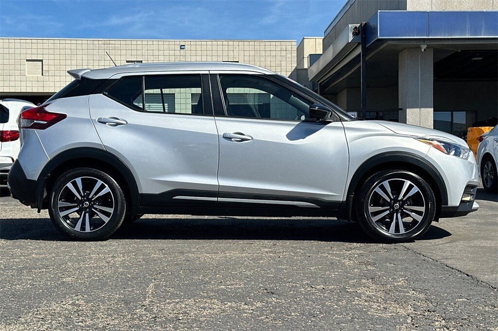 This 2020 Brilliant Silver Metallic Nissan Kicks SR FWD is well equipped and includes these features and benefits: SR Premium Package (Bose Personal Plus Audio System, Heated Front Seats, Prima-Tex Appointed Seat Trim, and Security System), 17" Alloy Wheels, 3.927 Axle Ratio, 6 Speakers, ABS brakes, Air Conditioning, Alloy wheels, AM/FM radio: SiriusXM, Auto High-beam Headlights, Automatic temperature control, Blind Spot Warning, Brake assist, Bumpers: body-color, Carpeted Floor Mats w/Cargo Mat, Center Armrest w/Storage, Cloth Seat Trim, Compass, Delay-off headlights, Driver door bin, Driver vanity mirror, Driver's Seat Mounted Armrest, Dual front impact airbags, Dual front side impact airbags, Electronic Stability Control, Exterior Parking Camera Rear, Front anti-roll bar, Front Bucket Seats, Front fog lights, Front reading lights, Front wheel independent suspension, Fully automatic headlights, Heated door mirrors, Illuminated entry, Knee airbag, Leather Shift Knob, Low tire pressure warning, NissanConnect featuring Apple CarPlay and Android Auto, Occupant sensing airbag, Outside temperature display, Overhead airbag, Panic alarm, Passenger door bin, Passenger vanity mirror, Power door mirrors, Power steering, Power windows, Radio data system, Radio: AM/FM Audio System, Rear Parking Sensors, Rear reading lights, Rear Roof Spoiler, Rear side impact airbag, Rear window defroster, Rear window wiper, Remote keyless entry, Roof rack: rails only, Speed control, Splash Guards Grain (4 Piece), Split folding rear seat, Spoiler, Sport steering wheel, Steering wheel mounted audio controls, Tachometer, Telescoping steering wheel, Tilt steering wheel, Traction control, Trip computer, Turn signal indicator mirrors, and Variably intermittent wipers.