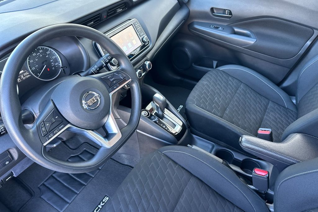 This 2021 Electric Blue Metallic Nissan Kicks S FWD is well equipped and includes these features and benefits: 16" Steel Wheels w/Full Covers, 3.927 Axle Ratio, 6 Speakers, ABS brakes, Air Conditioning, AM/FM radio, Apple CarPlay/Android Auto, Auto High-beam Headlights, Blind Spot Warning, Brake assist, Bumpers: body-color, Carpeted Floor Mats w/Cargo Mat, Center Armrest w/Storage, Cloth Seat Trim, Driver door bin, Driver vanity mirror, Driver's Seat Mounted Armrest, Dual front impact airbags, Dual front side impact airbags, Electronic Stability Control, Front anti-roll bar, Front Bucket Seats, Front reading lights, Front wheel independent suspension, Fully automatic headlights, Illuminated entry, Knee airbag, Low tire pressure warning, Occupant sensing airbag, Outside temperature display, Overhead airbag, Panic alarm, Passenger door bin, Passenger vanity mirror, Power door mirrors, Power steering, Power windows, Radio data system, Radio: AM/FM Audio System, Rear Parking Sensors, Rear reading lights, Rear side impact airbag, Rear window defroster, Rear window wiper, Remote keyless entry, Speed control, Splash Guards Grain (4 Piece), Split folding rear seat, Sport steering wheel, Steering wheel mounted audio controls, Tachometer, Telescoping steering wheel, Tilt steering wheel, Traction control, Trip computer, and Variably intermittent wipers.